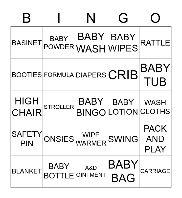 This bingo card has a free space and 24 words: ONSIES, BABY BOTTLE, DIAPERS, BLANKET, RATTLE, BASINET, BOOTIES, BABY POWDER, BABY LOTION, WIPE WARMER, CRIB, HIGH CHAIR, SWING, PACK AND PLAY, FORMULA, BABY BAG, WASH CLOTHS, BABY WASH, BABY TUB, STROLLER, CARRIAGE, SAFETY PIN, BABY WIPES and A&D OINTMENT.