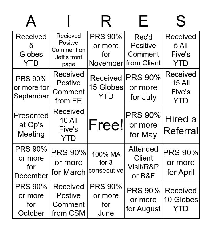 This bingo card has a free space and 24 words: PRS 90% or more for March, Received Postive Comment from CSM, Received 15 Globes YTD, PRS 90% or more for October, Received 5 All Five's YTD, Received 5 Globes YTD, PRS 90% or more for September, Recieved Positve Comment on Jeff's front page, PRS 90% or more for May, 100% MA for 3 consecutive, PRS 90% or more for July, Presented at Op's Meeting, Attended Client Visit/R&P or B&F, PRS 90% or more for April, Received Postive Comment from EE, PRS 90% or more for August, Hired a Referral, PRS 90% or more for November, Received 15 All Five's YTD, Received 10 All Five's YTD, Received 10 Globes YTD, PRS 90% or more for December, Rec'd Positive Comment from Client and PRS 90% or more for June.