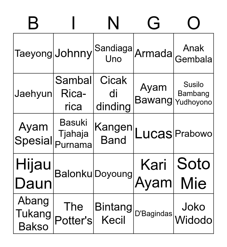 This bingo card has 25 words: Balonku, Bintang Kecil, Cicak di dinding, Abang Tukang Bakso, Anak Gembala, Taeyong, Jaehyun, Johnny, Lucas, Doyoung, Ayam Bawang, Ayam Spesial, Kari Ayam, Soto Mie, Sambal Rica-rica, Joko Widodo, Prabowo, Sandiaga Uno, Susilo Bambang Yudhoyono, Basuki Tjahaja Purnama, Kangen Band, The Potter's, Hijau Daun, Armada and D'Bagindas.