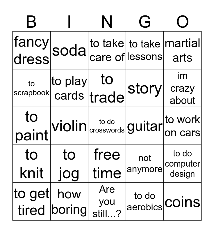 This bingo card has 40 words: to participate, to paint, poem, to play cards, how boring, free time, to trade, comic books, martial arts, to knit, violin, to take lessons, to do crosswords, to work on cars, guitar, to jog, to enjoy, fancy dress, to design webpages, to take care of, to do computer design, to do aerobics, story, to scrapbook, to burn CD's, to sew, to collect, stamps, coins, posters, to talk/chat, to get tired, to get bored, not anymore, im crazy about, Are you still...?, a lot of time, a short time, soda and cat.