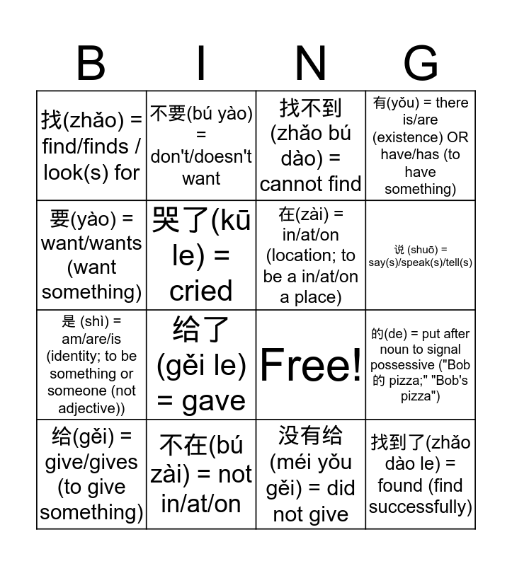 This bingo card has 22 words: 不在(bú zài) = not in/at/on, 不是(bú shì) = NOT am/are/is (identity; to be something or someone), 不要(bú yào) = don't/doesn't want, 哭(kū) = cry / cries, 哭了(kū le) = cried, 在(zài) = in/at/on (location; to be a in/at/on a place), 找(zhǎo) = find/finds / look(s) for, 找不到(zhǎo bú dào) = cannot find, Free!, 找到了(zhǎo dào le) = found (find successfully), 是 (shì) = am/are/is (identity; to be something or someone (not adjective)), 有(yǒu) = there is/are (existence) OR have/has (to have something), 没哭(méi kū) = didn't cry, 没有(méi yǒu) = there isn't/aren't OR don't/doesn't have (to not have something), 没有给(méi yǒu gěi) = did not give, 没说(méi shuō) = didn't say/speak/tell, 的(de) = put after noun to signal possessive ("Bob 的 pizza;" "Bob's pizza"), 给(gěi) = give/gives (to give something), 给了(gěi le) = gave, 要(yào) = want/wants (want something), 说 (shuō) = say(s)/speak(s)/tell(s) and 说了(shuō le) = said/spoke/told.