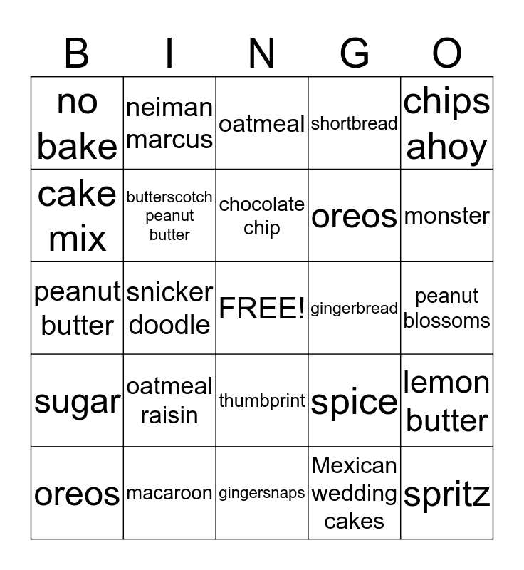 This bingo card has a free space and 24 words: oatmeal raisin, macaroon, chocolate chip, oreos, chips ahoy, no bake, cake mix, neiman marcus, gingerbread, thumbprint, oreos, peanut butter, spice, lemon butter, butterscotch peanut butter, Mexican wedding cakes, peanut blossoms, oatmeal, monster, snicker doodle, spritz, sugar, shortbread and gingersnaps.