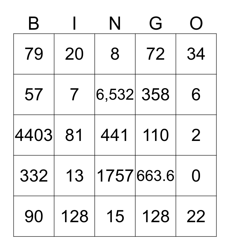This bingo card has 25 words: 13, 15, 6,532, 90, 34, 79, 57, 20, 110, 1757, 358, 4403, 663.6, 0, 7, 22, 2, 8, 6, 81, 441, 128, 332, 72 and 128.