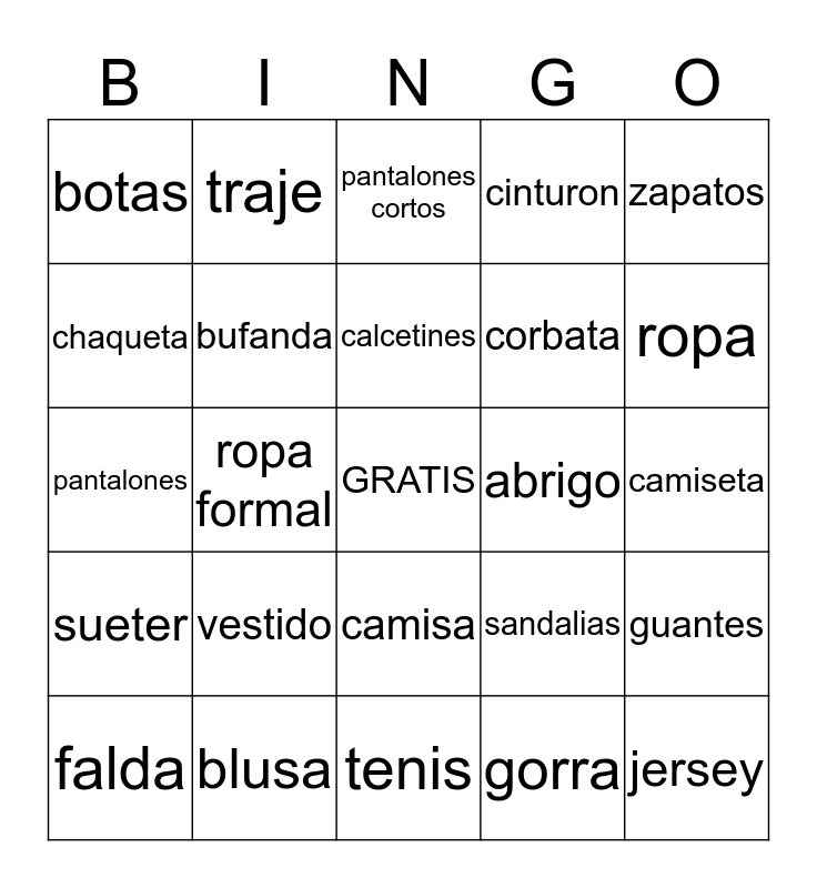 This bingo card has a free space and 24 words: vestido, blusa, calcetines, falda, zapatos, botas, chaqueta, traje, abrigo, camisa, corbata, pantalones, sandalias, guantes, bufanda, gorra, camiseta, pantalones cortos, ropa, ropa formal, jersey, sueter, cinturon and tenis.