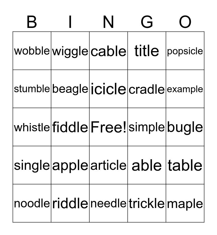 This bingo card has a free space and 25 words: apple, needle, icicle, noodle, popsicle, wobble, stumble, wiggle, simple, article, cradle, whistle, able, table, beagle, beetle, bugle, cable, example, fiddle, maple, riddle, single, title and trickle.