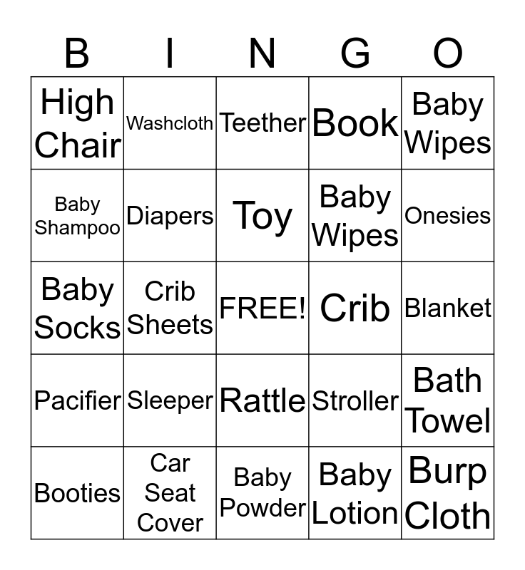This bingo card has a free space and 24 words: Sleeper, Car Seat Cover, Toy, Booties, Baby Wipes, High Chair, Baby Shampoo, Washcloth, Crib, Rattle, Baby Wipes, Baby Socks, Stroller, Bath Towel, Diapers, Baby Lotion, Blanket, Teether, Onesies, Crib Sheets, Burp Cloth, Pacifier, Book and Baby Powder.