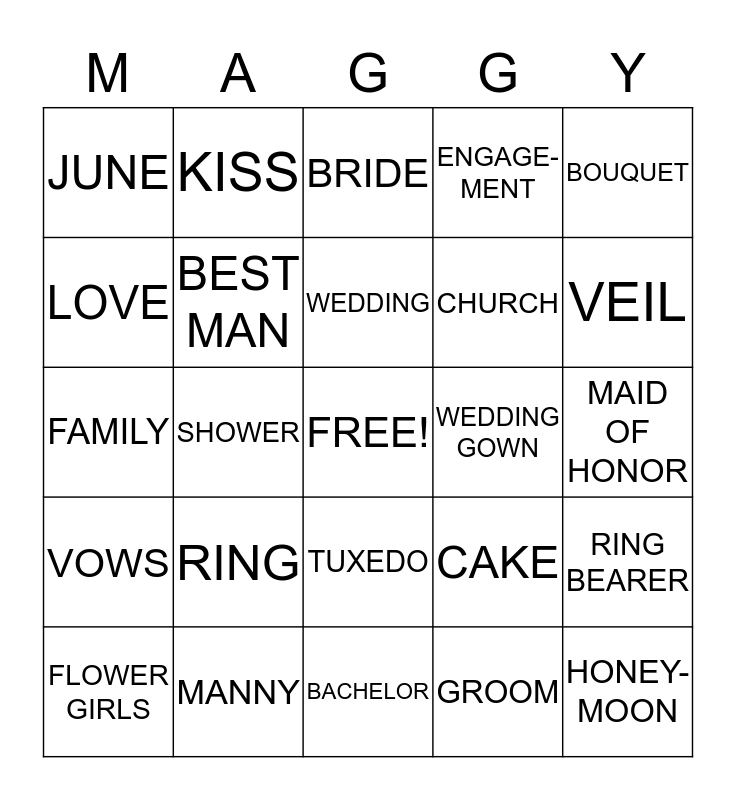 This bingo card has a free space and 24 words: RING, MANNY, WEDDING, FLOWER GIRLS, BOUQUET, JUNE, LOVE, KISS, WEDDING GOWN, TUXEDO, CHURCH, FAMILY, CAKE, RING BEARER, BEST MAN, GROOM, MAID OF HONOR, BRIDE, VEIL, SHOWER, HONEY-MOON, VOWS, ENGAGE-MENT and BACHELOR.