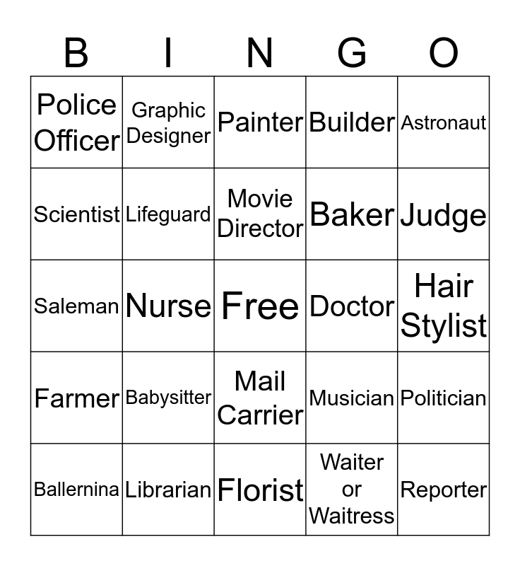 This bingo card has a free space and 34 words: Architect, Waiter or Waitress, Teacher, Singer, Farmer, Lifeguard, Astronaut, Ballernina, Graphic Designer, Firefighter, Movie Director, Painter, Real Estate Agent, Veterinarian, Doctor, Judge, Librarian, Saleman, Babysitter, Musician, Mail Carrier, Mechanic, Police Officer, Hair Stylist, Florist, Reporter, Builder, Pilot, Baker, Scientist, Zookeeper, Nurse, Politician and Dentist.