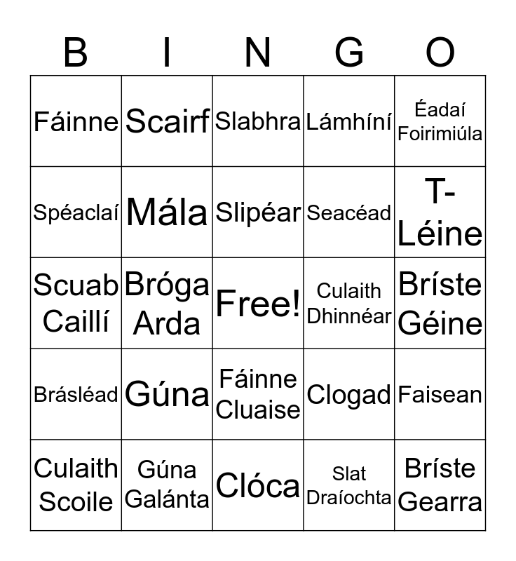 This bingo card has a free space and 29 words: Culaith Scoile, Geansaí, Bróga Arda, Muince, Fáinne, Slabhra, Mála, Gúna, Culaith Dhinnéar, Gúna Galánta, Bríste Géine, Bríste Gearra, Clóca, Slat Draíochta, T-Léine, Hata, Fáinne Cluaise, Brásléad, Éadaí Foirimiúla, Scuab Caillí, Clogad, Pillín, Seacéad, Spéaclaí, Lámhíní, Scairf, Faisean, Slipéar and Cóta Tí.
