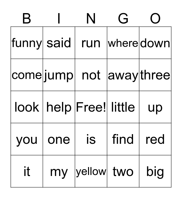 This bingo card has a free space and 24 words: one, my, not, it, down, funny, come, said, little, is, away, look, find, red, jump, two, up, run, three, help, big, you, where and yellow.
