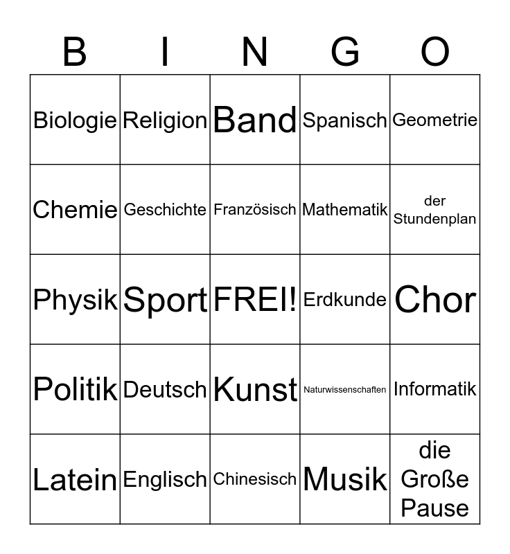 This bingo card has a free space and 24 words: Deutsch, Englisch, Französisch, Latein, Geometrie, Biologie, Chemie, Religion, Erdkunde, Kunst, Mathematik, Physik, Naturwissenschaften, Informatik, Geschichte, Musik, Chor, Band, der Stundenplan, Sport, die Große Pause, Politik, Spanisch and Chinesisch.