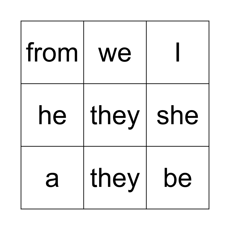 This bingo card has a free space and 9 words: a, I, we, he, from, she, be, me and they.