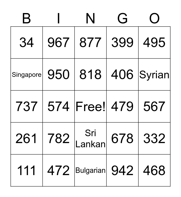This bingo card has a free space and 1233 words: 1, 2, 3, 4, 5, 6, 7, 8, 9, 10, 11, 12, 13, 14, 15, 16, 17, 18, 19, 20, 21, 22, 23, 24, 25, 26, 27, 28, 29, 30, 31, 32, 33, 34, 35, 36, 37, 38, 39, 40, 41, 42, 43, 44, 45, 46, 47, 48, 49, 50, 51, 52, 53, 54, 55, 56, 57, 58, 59, 60, 61, 62, 63, 64, 65, 66, 67, 68, 69, 70, 71, 72, 73, 74, 75, 76, 77, 78, 79, 80, 81, 82, 83, 84, 85, 86, 87, 88, 89, 90, 91, 92, 93, 94, 95, 96, 97, 98, 99, 100, 101, 102, 103, 104, 105, 106, 107, 108, 109, 110, 111, 112, 113, 114, 115, 116, 117, 118, 119, 120, 121, 122, 123, 124, 125, 126, 127, 128, 129, 130, 131, 132, 133, 134, 135, 136, 137, 138, 139, 140, 141, 142, 143, 144, 145, 146, 147, 148, 149, 150, 151, 152, 153, 154, 155, 156, 157, 158, 159, 160, 161, 162, 163, 164, 165, 166, 167, 168, 169, 170, 171, 172, 173, 174, 175, 176, 177, 178, 179, 180, 181, 182, 183, 184, 185, 186, 187, 188, 189, 190, 191, 192, 193, 194, 195, 196, 197, 198, 199, 200, 201, 202, 203, 204, 205, 206, 207, 208, 209, 210, 211, 212, 213, 214, 215, 216, 217, 218, 219, 220, 221, 222, 223, 224, 225, 226, 227, 228, 229, 230, 231, 232, 233, 234, 235, 236, 237, 238, 239, 240, 241, 242, 243, 244, 245, 246, 247, 248, 249, 250, 251, 252, 253, 254, 255, 256, 257, 258, 259, 260, 261, 262, 263, 264, 265, 266, 267, 268, 269, 270, 271, 272, 273, 274, 275, 276, 277, 278, 279, 280, 281, 282, 283, 284, 285, 286, 287, 288, 289, 290, 291, 292, 293, 294, 295, 296, 297, 298, 299, 300, 301, 302, 303, 304, 305, 306, 307, 308, 309, 310, 311, 312, 313, 314, 315, 316, 317, 318, 319, 320, 321, 322, 323, 324, 325, 326, 327, 328, 329, 330, 331, 332, 333, 334, 335, 336, 337, 338, 339, 340, 341, 342, 343, 344, 345, 346, 347, 348, 349, 350, 351, 352, 353, 354, 355, 356, 357, 358, 359, 360, 361, 362, 363, 364, 365, 366, 367, 368, 369, 370, 371, 372, 373, 374, 375, 376, 377, 378, 379, 380, 381, 382, 383, 384, 385, 386, 387, 388, 389, 390, 391, 392, 393, 394, 395, 396, 397, 398, 399, 400, 401, 402, 403, 404, 405, 406, 407, 408, 409, 410, 411, 412, 413, 414, 415, 416, 417, 418, 419, 420, 421, 422, 423, 424, 425, 426, 427, 428, 429, 430, 431, 432, 433, 434, 435, 436, 437, 438, 439, 440, 441, 442, 443, 444, 445, 446, 447, 448, 449, 450, 451, 452, 453, 454, 455, 456, 457, 458, 459, 460, 461, 462, 463, 464, 465, 466, 467, 468, 469, 470, 471, 472, 473, 474, 475, 476, 477, 478, 479, 480, 481, 482, 483, 484, 485, 486, 487, 488, 489, 490, 491, 492, 493, 494, 495, 496, 497, 498, 499, 500, 501, 502, 503, 504, 505, 506, 507, 508, 509, 510, 511, 512, 513, 514, 515, 516, 517, 518, 519, 520, 521, 522, 523, 524, 525, 526, 527, 528, 529, 530, 531, 532, 533, 534, 535, 536, 537, 538, 539, 540, 541, 542, 543, 544, 545, 546, 547, 548, 549, 550, 551, 552, 553, 554, 555, 556, 557, 558, 559, 560, 561, 562, 563, 564, 565, 566, 567, 568, 569, 570, 571, 572, 573, 574, 575, 576, 577, 578, 579, 580, 581, 582, 583, 584, 585, 586, 587, 588, 589, 590, 591, 592, 593, 594, 595, 596, 597, 598, 599, 600, 601, 602, 603, 604, 605, 606, 607, 608, 609, 610, 611, 612, 613, 614, 615, 616, 617, 618, 619, 620, 621, 622, 623, 624, 625, 626, 627, 628, 629, 630, 631, 632, 633, 634, 635, 636, 637, 638, 639, 640, 641, 642, 643, 644, 645, 646, 647, 648, 649, 650, 651, 652, 653, 654, 655, 656, 657, 658, 659, 660, 661, 662, 663, 664, 665, 666, 667, 668, 669, 670, 671, 672, 673, 674, 675, 676, 677, 678, 679, 680, 681, 682, 683, 684, 685, 686, 687, 688, 689, 690, 691, 692, 693, 694, 695, 696, 697, 698, 699, 700, 701, 702, 703, 704, 705, 706, 707, 708, 709, 710, 711, 712, 713, 714, 715, 716, 717, 718, 719, 720, 721, 722, 723, 724, 725, 726, 727, 728, 729, 730, 731, 732, 733, 734, 735, 736, 737, 738, 739, 740, 741, 742, 743, 744, 745, 746, 747, 748, 749, 750, 751, 752, 753, 754, 755, 756, 757, 758, 759, 760, 761, 762, 763, 764, 765, 766, 767, 768, 769, 770, 771, 772, 773, 774, 775, 776, 777, 778, 779, 780, 781, 782, 783, 784, 785, 786, 787, 788, 789, 790, 791, 792, 793, 794, 795, 796, 797, 798, 799, 800, 801, 802, 803, 804, 805, 806, 807, 808, 809, 810, 811, 812, 813, 814, 815, 816, 817, 818, 819, 820, 821, 822, 823, 824, 825, 826, 827, 828, 829, 830, 831, 832, 833, 834, 835, 836, 837, 838, 839, 840, 841, 842, 843, 844, 845, 846, 847, 848, 849, 850, 851, 852, 853, 854, 855, 856, 857, 858, 859, 860, 861, 862, 863, 864, 865, 866, 867, 868, 869, 870, 871, 872, 873, 874, 875, 876, 877, 878, 879, 880, 881, 882, 883, 884, 885, 886, 887, 888, 889, 890, 891, 892, 893, 894, 895, 896, 897, 898, 899, 900, 901, 902, 903, 904, 905, 906, 907, 908, 909, 910, 911, 912, 913, 914, 915, 916, 917, 918, 919, 920, 921, 922, 923, 924, 925, 926, 927, 928, 929, 930, 931, 932, 933, 934, 935, 936, 937, 938, 939, 940, 941, 942, 943, 944, 945, 946, 947, 948, 949, 950, 951, 952, 953, 954, 955, 956, 957, 958, 959, 960, 961, 962, 963, 964, 965, 966, 967, 968, 969, 970, 971, 972, 973, 974, 975, 976, 977, 978, 979, 980, 981, 982, 983, 984, 985, 986, 987, 988, 989, 990, 991, 992, 993, 994, 995, 996, 997, 998, 999, 1000, Afghanistan, Albania, Algeria, Argentina, Australia, Austria, Bangladesh, Belgium, Bolivia, Botswana, Brazil, Bulgaria, Cambodia, Cameroon, Canada, Chile, China, Colombia *, Costa Rica, Croatia, Cuba, Czech Republic, Denmark, Dominican Republic, Ecuador, Egypt, El Salvador, England, Estonia, Ethiopia, Fiji, Finland, France, Germany, Ghana, Greece, Guatemala, Haiti, Honduras, Hungary, Iceland, India, Indonesia, Iran, Iraq, Ireland, Israel, Italy, Jamaica, Japan, Jordan, Kenya, Kuwait, Laos, Latvia, Lebanon, Libya, Lithuania, Malaysia, Mali, Malta, Mexico, Mongolia, Morocco, Mozambique, Namibia, Nepal, Netherlands, New Zealand, Nicaragua, Nigeria, Norway, Pakistan, Panama, Paraguay, Peru, Philippines, Poland, Portugal, Romania, Russia, Saudi Arabia, Scotland, Senegal, Serbia, Singapore, Slovakia, South Africa, South Korea, Spain, Sri Lanka, Sudan, Sweden, Switzerland, Syria, Taiwan, Tajikistan, Thailand, Tonga, Tunisia, Turkey, Ukraine, United Arab Emirates, (The) United Kingdom, (The) United States, Uruguay, Venezuela, Vietnam, Wales, Zambia, 