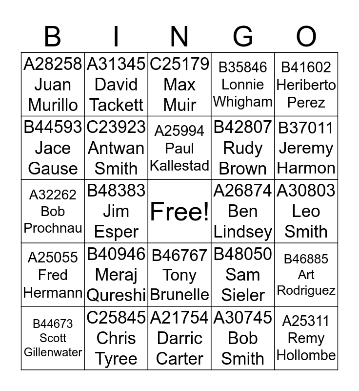 This bingo card has a free space and 29 words: B44673 Scott Gillenwater, A30000 Jeffrey Rueden, B48383 Jim Esper, A29734 Troy Roark, A28258 Juan Murillo, C25179 Max Muir, C23923 Antwan Smith, B40946 Meraj Qureshi, A26874 Ben Lindsey, C25845 Chris Tyree, A30803 Leo Smith, A25311 Remy Hollombe, A21754 Darric Carter, A30745 Bob Smith, B37011 Jeremy Harmon, C24214 Jerry Mays, B46767 Tony Brunelle, A25055 Fred Hermann, B41602 Heriberto Perez, A32262 Bob Prochnau, B48050 Sam Sieler, B48449 Daniel Rivera, B42807 Rudy Brown, B44593 Jace Gause, B35846 Lonnie Whigham, A31345 David Tackett, B46885 Art Rodriguez, A25994 Paul Kallestad and B38254 Randy Collier.