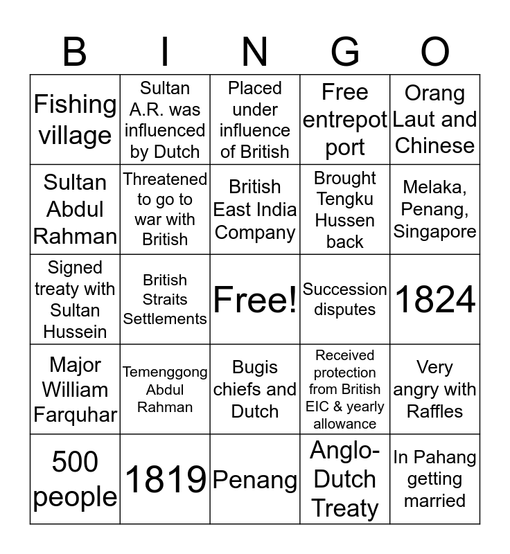 This bingo card has a free space and 24 words: Temenggong Abdul Rahman, 1819, British East India Company, 500 people, Orang Laut and Chinese, Fishing village, Sultan Abdul Rahman, Sultan A.R. was influenced by Dutch, Succession disputes, Bugis chiefs and Dutch, Brought Tengku Hussen back, Signed treaty with Sultan Hussein, Received protection from British EIC & yearly allowance, Very angry with Raffles, Threatened to go to war with British, Anglo-Dutch Treaty, 1824, Placed under influence of British, Melaka, Penang, Singapore, British Straits Settlements, In Pahang getting married, Major William Farquhar, Free entrepot port and Penang.