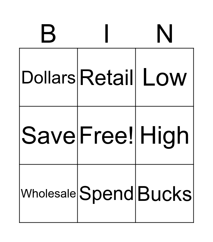 This bingo card has a free space and 8 words: High, Low, Retail, Wholesale, Dollars, Bucks, Save and Spend.