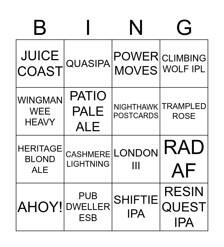 This bingo card has 20 words: RAD AF, FLORIDA MAN, POWER MOVES, 816, AHOY!, WINGMAN WEE HEAVY, PUB DWELLER ESB, JUICE COAST, HERITAGE BLOND ALE, QUASIPA, CASHMERE LIGHTNING, LONDON III, PATIO PALE ALE, RESIN QUEST IPA, NIGHTHAWK POSTCARDS, RIBBON CUTTER, TRAMPLED ROSE, CLIMBING WOLF IPL, SHIFTIE IPA and STRAWBERRY BLOND.