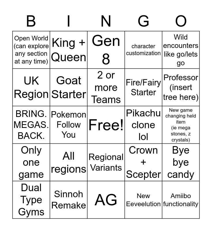 This bingo card has a free space and 24 words: All regions, Sinnoh Remake, 2 or more Teams, Dual Type Gyms, Wild encounters like go/lets go, Open World (can explore any section at any time), UK Region, King + Queen, Pikachu clone lol, Regional Variants, Fire/Fairy Starter, BRING. MEGAS. BACK., Crown + Scepter, Bye bye candy, Goat Starter, New Eeveelution, New game changing held item (ie mega stones, z crystals), Gen 8, Professor (insert tree here), Pokemon Follow You, Amiibo functionality, Only one game, character customization and AG.