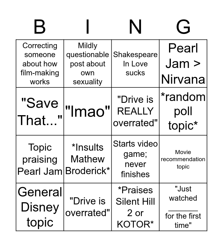 This bingo card has 16 words: "Drive is overrated", Movie recommendation topic, Shakespeare In Love sucks, Correcting someone about how film-making works, Topic praising Pearl Jam, Mildly questionable post about own sexuality, Starts video game; never finishes, *Praises Silent Hill 2 or KOTOR*, "Save That...", "lmao", General Disney topic, Pearl Jam > Nirvana, *Insults Mathew Broderick*, *random poll topic*, "Drive is REALLY overrated" and "Just watched _______ for the first time".