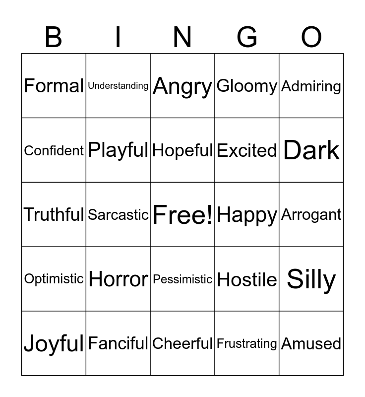 This bingo card has a free space and 29 words: Joyful, Melancholy, Sarcastic, Suspicious, Formal, Angry, Playful, Horror, Happy, Fanciful, Arrogant, Amused, Cheerful, Frustrating, Dark, Respectful, Pessimistic, Optimistic, Admiring, Truthful, Hostile, Critical, Excited, Confident, Gloomy, Understanding, Silly, Hopeful and Regretful.
