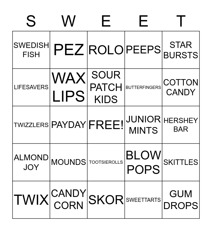 This bingo card has a free space and 36 words: MILK DUDS, PIXIE STICKS, NECCO WAFERS, WAX LIPS, BLOW POPS, ALMOND JOY, SOUR PATCH KIDS, ATOMIC FIREBALL, STAR BURSTS, BABY RUTH, PAYDAY, PEEPS, REESE'S PIECES, JUNIOR MINTS, COTTON CANDY, SWEDISH FISH, MILKY WAY, MOUNDS, GUM DROPS, ROLO, HERSHEY BAR, SKITTLES, CANDY CORN, TWIX, SKOR, PEZ, TWIZZLERS, M&M'S, BUTTERFINGERS, LIFESAVERS, NUTROLL, REDHOTS, SWEETTARTS, TOOTSIEROLLS, MOUNDS and WHOPPERS.