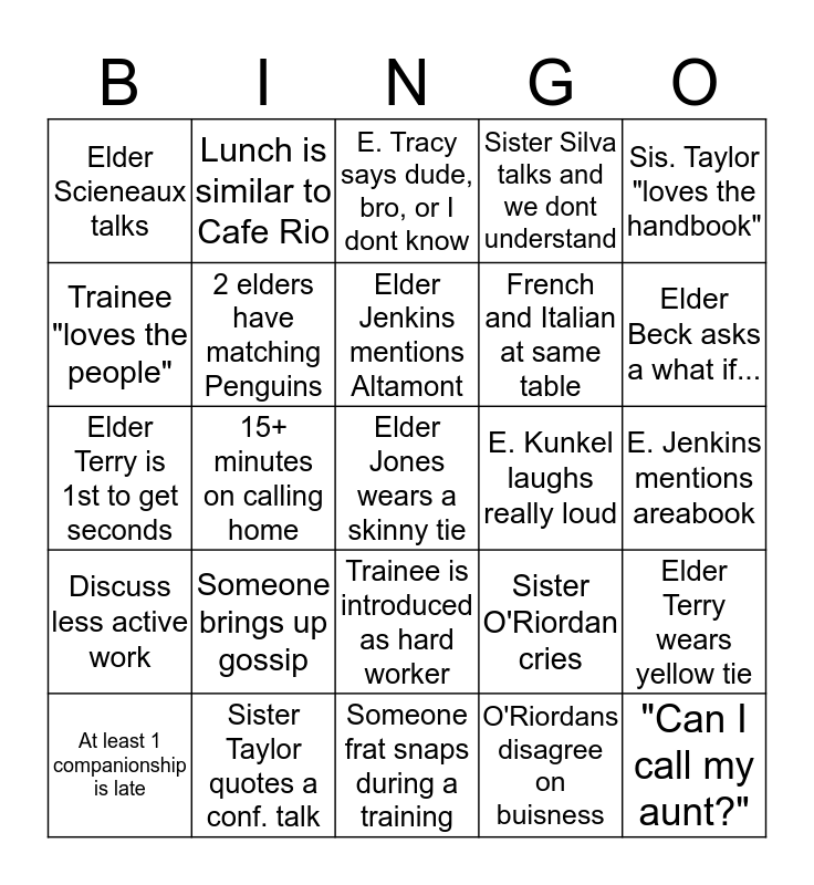 This bingo card has a free space and 24 words: Someone brings up gossip, Sister Taylor quotes a conf. talk, Elder Jenkins mentions Altamont, At least 1 companionship is late, Sis. Taylor "loves the handbook", Elder Scieneaux talks, Trainee "loves the people", Lunch is similar to Cafe Rio, E. Kunkel laughs really loud, Trainee is introduced as hard worker, French and Italian at same table, Elder Terry is 1st to get seconds, Sister O'Riordan cries, Elder Terry wears yellow tie, 2 elders have matching Penguins, O'Riordans disagree on buisness, E. Jenkins mentions areabook, E. Tracy says dude, bro, or I dont know, Elder Beck asks a what if..., 15+ minutes on calling home, "Can I call my aunt?", Discuss less active work, Sister Silva talks and we dont understand and Someone frat snaps during a training.