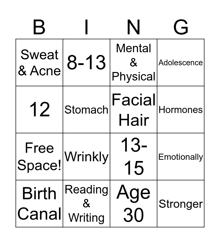 This bingo card has 20 words: Birth Canal, Uterus, Mental & Physical, Emotionally, Brittle, Wrinkly, Age 30, Adolescence, Free Space!, 8-13, 13-15, Hormones, Sweat & Acne, Reading & Writing, Facial Hair, Under Arm Hair, 12, Stomach, 1-2 and Stronger.