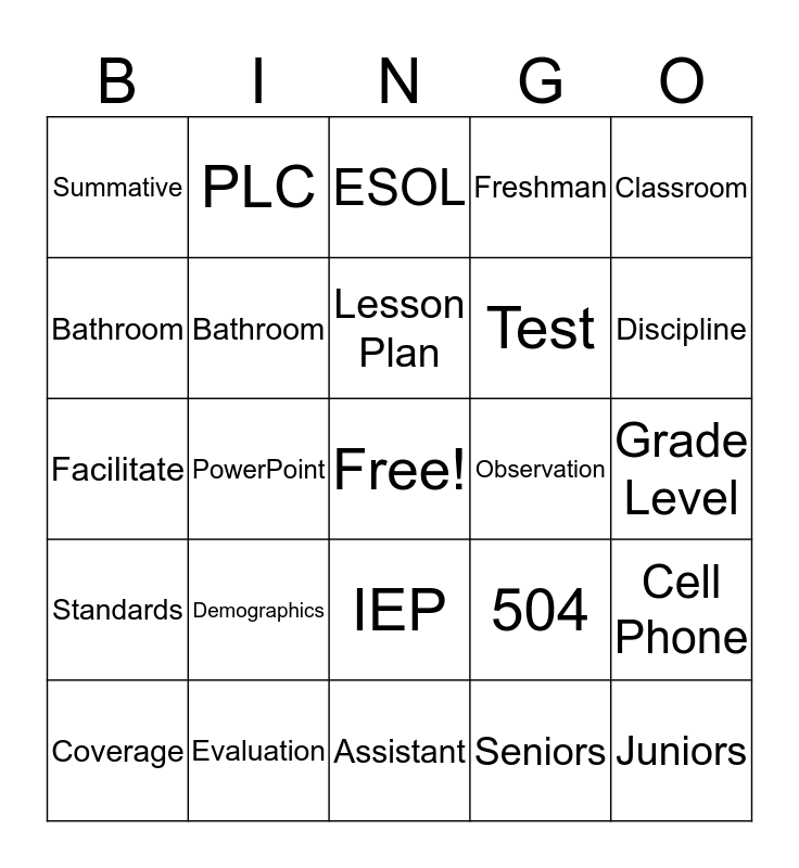 This bingo card has a free space and 34 words: Cofer, Seniors, ACT, SAT, Standards, Bathroom, Classroom, Coverage, PLC, Students, Lesson Plan, ESOL, Special Ed, Benchmark, Observation, Discipline, Evaluation, Facilitate, Demographics, 504, IEP, District, Summative, Grade Level, Assistant, Juniors, Freshman, Sophomore, Test, Bathroom, Spring Break, PowerPoint, Cell Phone and Parents.