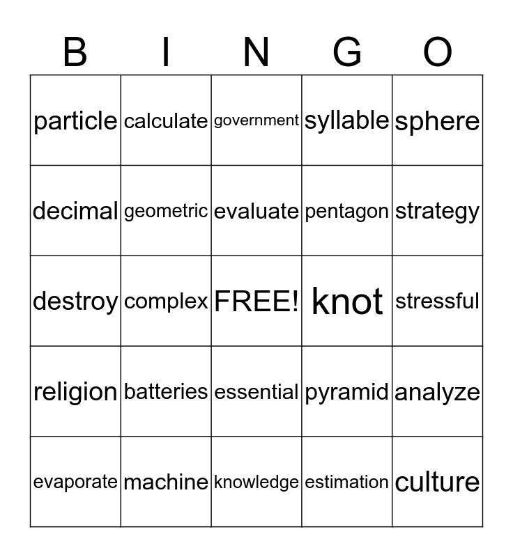 This bingo card has a free space and 24 words: batteries, machine, evaluate, evaporate, sphere, particle, decimal, calculate, knot, essential, pentagon, destroy, pyramid, analyze, geometric, estimation, stressful, government, strategy, complex, culture, religion, syllable and knowledge.