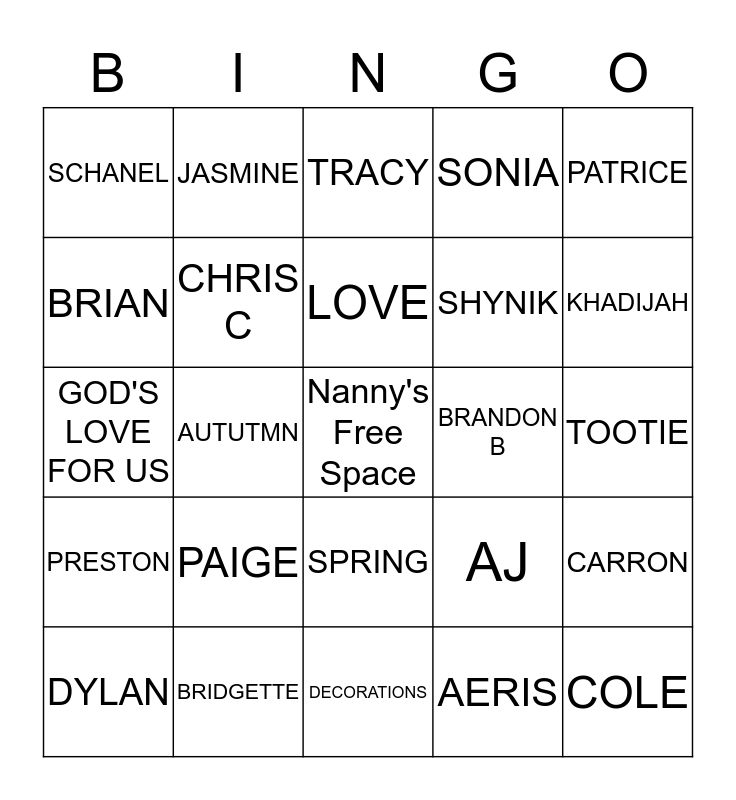 This bingo card has a free space and 70 words: JOYCE, TOOTIE, RONNIE, SHEILA, BRIDGETTE, TINA, SONIA, TARA, PATRICE, SEAN, CARRON, AMBER, SCHANEL, TRACY, SUMMER, AUTUTMN, SPRING, SHYNIK, TINAYA, PRESTON, BRANDON B, AJ, KHADIJAH, PATRICK, ERIANN, DARIEN, GARIELLA, GRANT, AERIS, CHASE, JASMINE, CJ, TJ, LONDYN, DOM, BREE, BROOKLYNN, BELLA, BRANDON W, BRIAN, MADDISAN, PAIGE, COLE, BRYCE, KYLAN, CHRIS C, DYLAN, ERIC, CHRIS N, BUBBA, CURTIS, BIG MOMA, PAPA, MERRY CHRISTMAS, DECORATIONS, GIFTS, LOVE, PEACE, GOOD FOOD, GOOD FRIENDS, GOD'S LOVE FOR US, GUMBO, LAUGHTER, GAMES, CHRISTMAS LIGHTS, CHTRISTMAST TREE, DMICAH, CHRISTMAS COOKIES, JESUS and PRAYER.