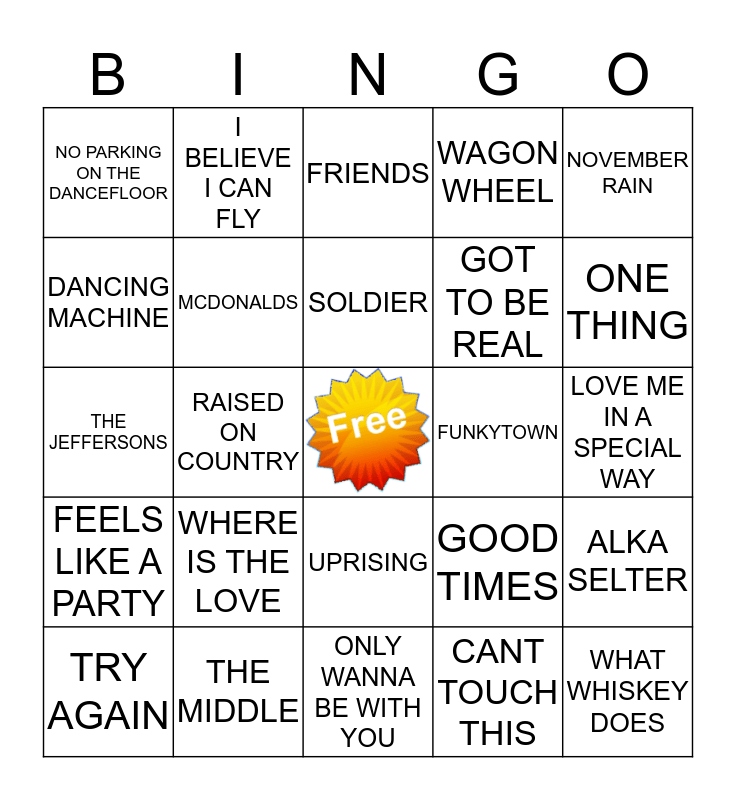 This bingo card has a free space and 24 words: WHERE IS THE LOVE, THE MIDDLE, SOLDIER, TRY AGAIN, NOVEMBER RAIN, NO PARKING ON THE DANCEFLOOR, DANCING MACHINE, I BELIEVE I CAN FLY, FUNKYTOWN, UPRISING, GOT TO BE REAL, THE JEFFERSONS, GOOD TIMES, ALKA SELTER, MCDONALDS, CANT TOUCH THIS, LOVE ME IN A SPECIAL WAY, FRIENDS, ONE THING, RAISED ON COUNTRY, WHAT WHISKEY DOES, FEELS LIKE A PARTY, WAGON WHEEL and ONLY WANNA BE WITH YOU.