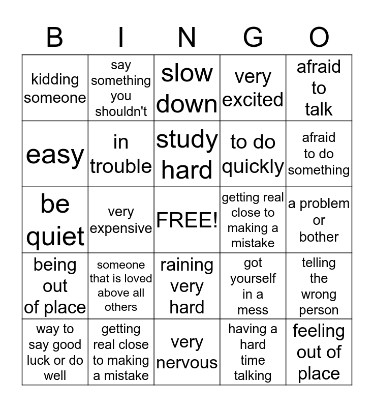 This bingo card has a free space and 24 words: someone that is loved above all others, getting real close to making a mistake, study hard, way to say good luck or do well, afraid to talk, kidding someone, easy, say something you shouldn't, getting real close to making a mistake, raining very hard, to do quickly, be quiet, got yourself in a mess, telling the wrong person, in trouble, having a hard time talking, a problem or bother, slow down, afraid to do something, very expensive, feeling out of place, being out of place, very excited and very nervous.
