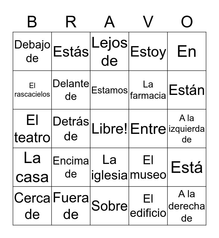 This bingo card has a free space and 29 words: Cerca de, Al lado de, Detrás de, Enfrente de, Debajo de, Lejos de, Delante de, Encima de, Entre, Fuera de, A la izquierda de, A la derecha de, Sobre, El edificio, Están, La librería, La iglesia, La casa, En, El teatro, El museo, El hospital, La farmacia, El rascacielos, Estoy, Estás, Está, Estamos and Estáis.