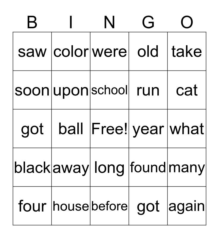 This bingo card has a free space and 50 words: big, house, because, got, many, stand, color, put, run, night, soon, upon, found, again, home, boy, were, year, think, saw, away, before, old, cat, pretty, mother, school, am, take, black, mother, after, say, girl, house, who, book, their, down, got, put, came, live, morning, four, ball, long, stand, what and where.