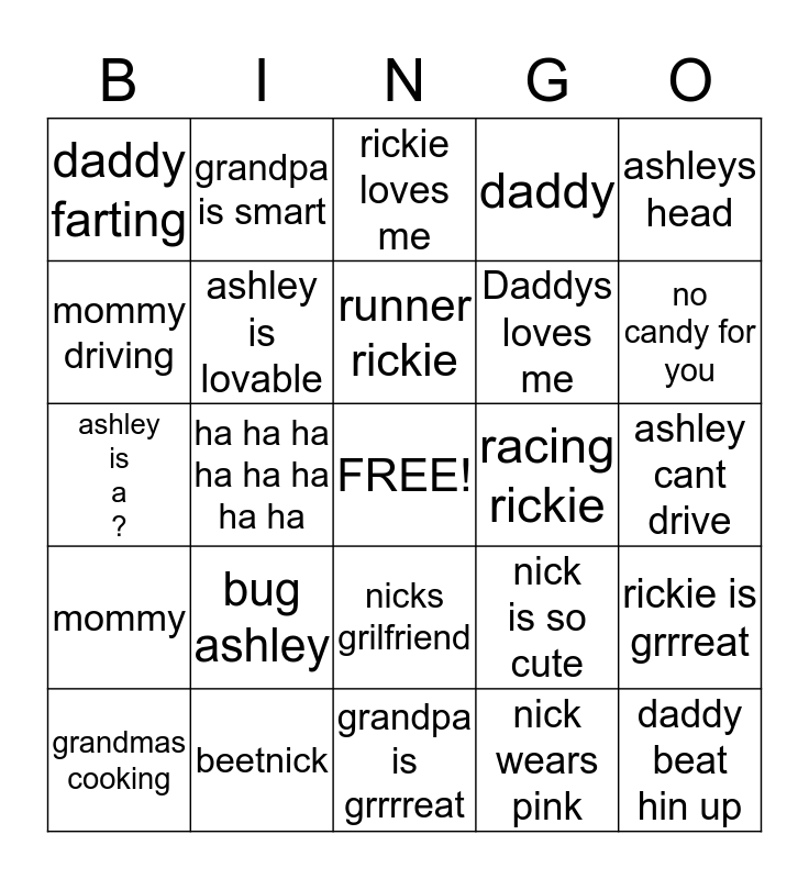 This bingo card has a free space and 24 words: bug ashley, beetnick, runner rickie, grandmas cooking, ashleys head, daddy farting, mommy driving, grandpa is smart, racing rickie, nicks grilfriend, Daddys loves me, ashley is a ?, nick is so cute, rickie is grrreat, ashley is lovable, nick wears pink, ashley cant drive, rickie loves me, no candy for you, ha ha ha ha ha ha ha ha, daddy beat hin up, mommy, daddy and grandpa is grrrreat.