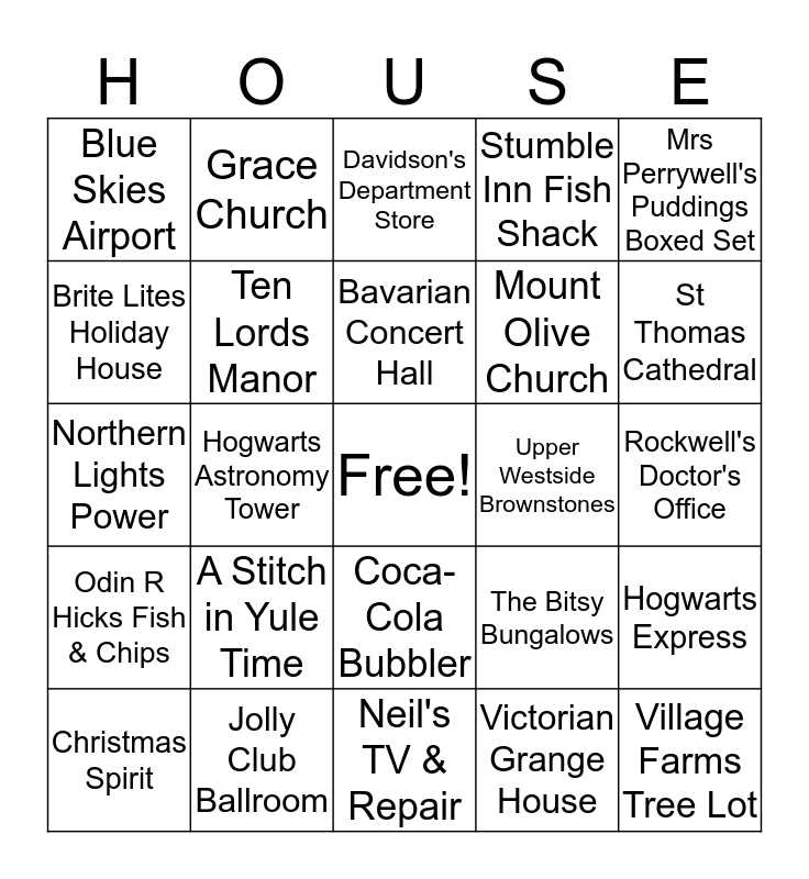 This bingo card has a free space and 34 words: Royal Bank of Cornhill, Victorian Grange House, Fullarton Station, The Emerald Express Tour, Odin R Hicks Fish & Chips, Ten Lords Manor, Mrs Perrywell's Puddings Boxed Set, Christmas Spirit, Grace Church, Linderbrau Beer Hall, Bavarian Concert Hall, Davidson's Department Store, Midtown Pets, Lincoln Station, Upper Westside Brownstones, St Thomas Cathedral, Jolly Club Ballroom, Northern Lights Power, A Stitch in Yule Time, The Bitsy Bungalows, Coca-Cola Bubbler, Scout Elves in Training, Blue Skies Airport, Rockwell's Doctor's Office, Neil's TV & Repair, Village Farms Tree Lot, Stumble Inn Fish Shack, Scooter’s Diner, Mount Olive Church, Brite Lites Holiday House, Aunt Bethany’s House, Hogwarts Astronomy Tower, Hogwarts Express and The Burrow.