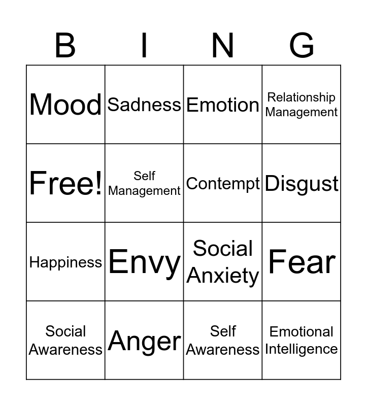 This bingo card has 16 words: Anger, Fear, Emotion, Mood, Happiness, Sadness, Social Anxiety, Self Awareness, Free!, Self Management, Social Awareness, Relationship Management, Envy, Disgust, Contempt and Emotional Intelligence.