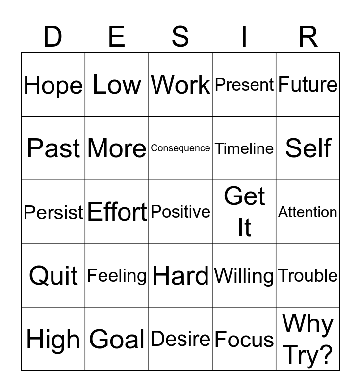 This bingo card has 31 words: Desire, Time, Effort, Accomplish, Hope, Work, More, Willing, Get It, Focus, Attention, Positive, Why Try?, Hurt, Self, Others, Trouble, Feeling, Quit, Hard, Future, Motivation, High, Low, Timeline, Past, Present, Persist, Goal, Consequence and Give Up.