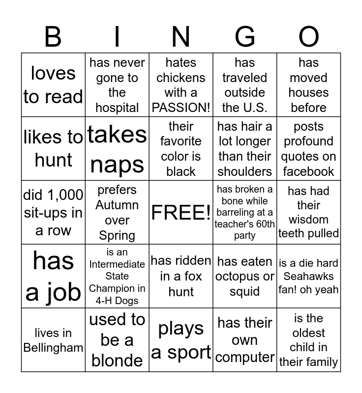 This bingo card has a free space and 24 words: is an Intermediate State Champion in 4-H Dogs, used to be a blonde, their favorite color is black, lives in Bellingham, has moved houses before, loves to read, likes to hunt, has never gone to the hospital, has broken a bone while barreling at a teacher's 60th party, has ridden in a fox hunt, has hair a lot longer than their shoulders, did 1,000 sit-ups in a row, has eaten octopus or squid, is a die hard Seahawks fan! oh yeah, takes naps, has their own computer, has had their wisdom teeth pulled, hates chickens with a PASSION!, posts profound quotes on facebook, prefers Autumn over Spring, is the oldest child in their family, has a job, has traveled outside the U.S. and plays a sport.