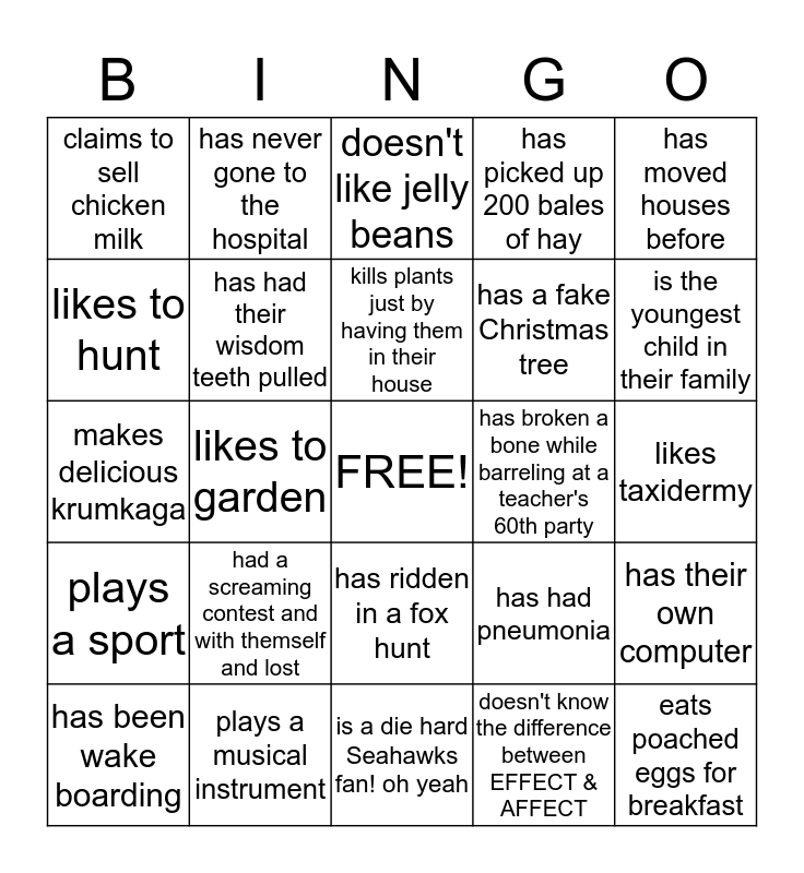 This bingo card has a free space and 24 words: had a screaming contest and with themself and lost, plays a musical instrument, kills plants just by having them in their house, has been wake boarding, has moved houses before, claims to sell chicken milk, likes to hunt, has never gone to the hospital, has broken a bone while barreling at a teacher's 60th party, has ridden in a fox hunt, has a fake Christmas tree, makes delicious krumkaga, has had pneumonia, has their own computer, has had their wisdom teeth pulled, doesn't know the difference between EFFECT & AFFECT, likes taxidermy, doesn't like jelly beans, is the youngest child in their family, likes to garden, eats poached eggs for breakfast, plays a sport, has picked up 200 bales of hay and is a die hard Seahawks fan! oh yeah.