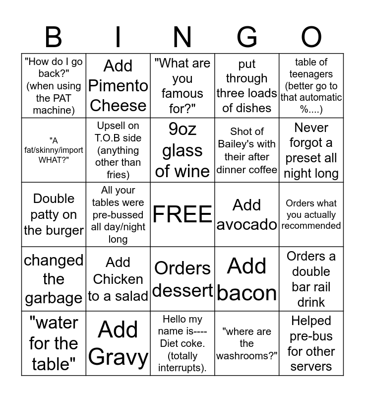 This bingo card has a free space and 24 words: Add Chicken to a salad, Add Gravy, 9oz glass of wine, "water for the table", table of teenagers (better go to that automatic %....), "How do I go back?" (when using the PAT machine), "A fat/skinny/import WHAT?", Add Pimento Cheese, Add avocado, Orders dessert, Shot of Bailey's with their after dinner coffee, Double patty on the burger, Add bacon, Orders a double bar rail drink, Upsell on T.O.B side (anything other than fries), "where are the washrooms?", Orders what you actually recommended, "What are you famous for?", Never forgot a preset all night long, All your tables were pre-bussed all day/night long, Helped pre-bus for other servers, changed the garbage, put through three loads of dishes and Hello my name is----Diet coke. (totally interrupts)..
