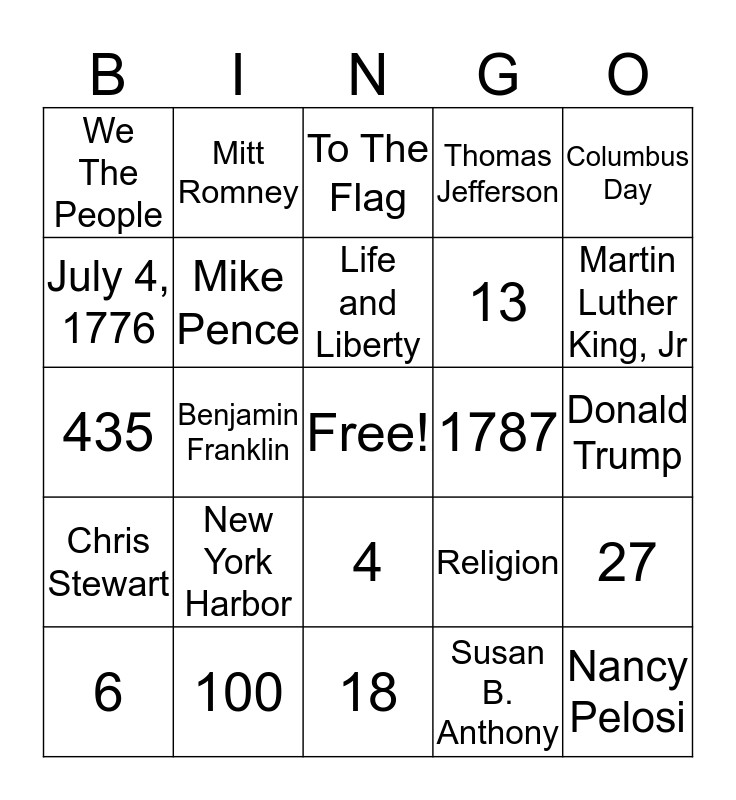This bingo card has a free space and 34 words: Gary Herbert, 50, April 15, 9, Donald Trump, July 4, 1776, Mike Pence, 18, 13, Nancy Pelosi, 435, Mitt Romney, Susan B. Anthony, 2, Chris Stewart, Benjamin Franklin, 4, 1787, 27, 6, 100, Woodrow Wilson, Thomas Jefferson, Martin Luther King, Jr, Civil War, New York Harbor, To The Flag, November, Columbus Day, We The People, The President, Life and Liberty, Religion and The executive Branch.