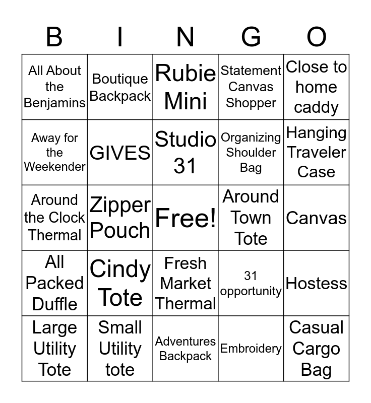 This bingo card has a free space and 24 words: Cindy Tote, Small Utility tote, Studio 31, Large Utility Tote, Close to home caddy, All About the Benjamins, Away for the Weekender, Boutique Backpack, Around Town Tote, Fresh Market Thermal, Organizing Shoulder Bag, Around the Clock Thermal, 31 opportunity, Hostess, GIVES, Embroidery, Canvas, Rubie Mini, Hanging Traveler Case, Zipper Pouch, Casual Cargo Bag, All Packed Duffle, Statement Canvas Shopper and Adventures Backpack.