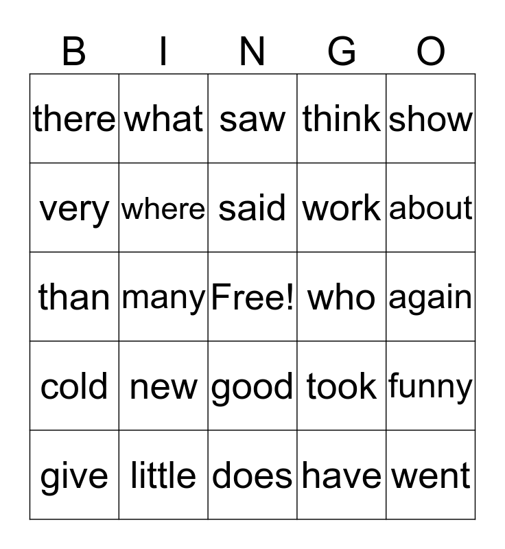This bingo card has a free space and 29 words: give, away, many, read, there, saw, where, new, who, little, again, went, does, have, about, want, good, cold, show, than, took, why, work, very, think, what, funny, said and done.