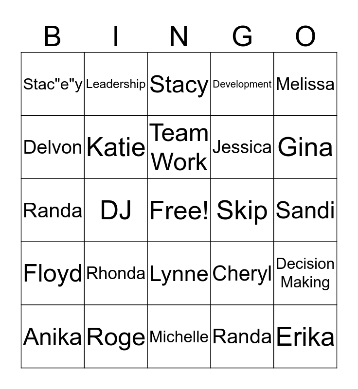 This bingo card has a free space and 29 words: Anika, Kathleen, DJ, Latoya, Stac"e"y, Stacy, Katie, Rhonda, Skip, Roge, Sandi, Erika, Michelle, Randa, Gina, Lisa, Lynne, Floyd, Melissa, Randa, Cheryl, Terez, Jessica, Delvon, Development, Leadership, Decision Making, Team Work and Communication.