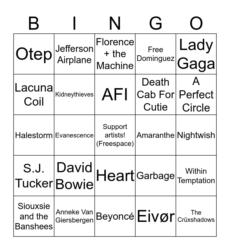 This bingo card has a free space and 24 words: David Bowie, Anneke Van Giersbergen, AFI, Siouxsie and the Banshees, Lady Gaga, Otep, Lacuna Coil, Jefferson Airplane, Amaranthe, Heart, Death Cab For Cutie, Halestorm, Garbage, Within Temptation, Kidneythieves, Eivør, Nightwish, Florence + the Machine, A Perfect Circle, Evanescence, The Crüxshadows, S.J. Tucker, Free Dominguez and Beyoncé.