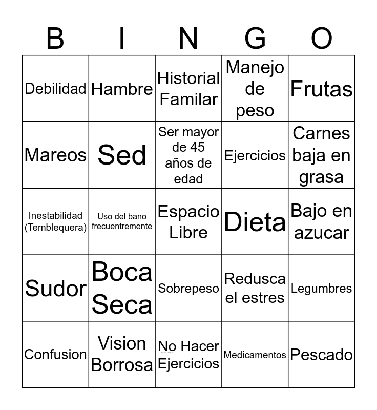 This bingo card has 1 images, a free space and 24 words: Confusion, Boca Seca, Ser mayor de 45 años de edad, Medicamentos, Frutas, Debilidad, Hambre, Historial Familar, Dieta, Bajo en azucar, Inestabilidad (Temblequera), Sed, Redusca el estres, Legumbres, Mareos, Vision Borrosa, No Hacer Ejercicios, Manejo de peso, Carnes baja en grasa, Sudor, Uso del bano frecuentremente, Sobrepeso, Ejercicios and Pescado.