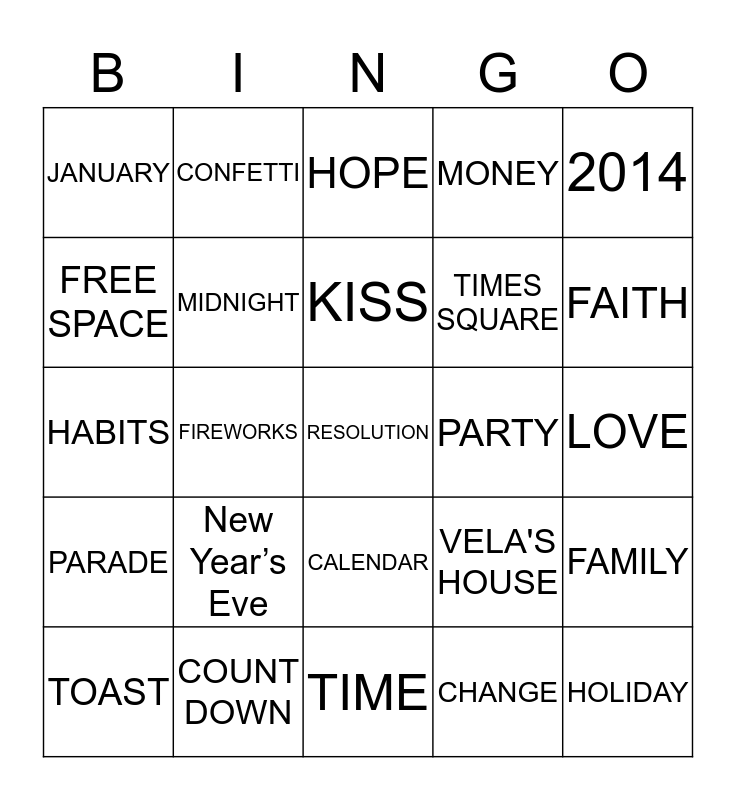 This bingo card has a free space and 24 words: New Year’s Eve, COUNT DOWN, KISS, TOAST, 2014, JANUARY, FREE SPACE, CONFETTI, PARTY, CALENDAR, TIMES SQUARE, HABITS, VELA'S HOUSE, FAMILY, MIDNIGHT, CHANGE, LOVE, HOPE, FAITH, FIREWORKS, HOLIDAY, PARADE, MONEY and TIME.