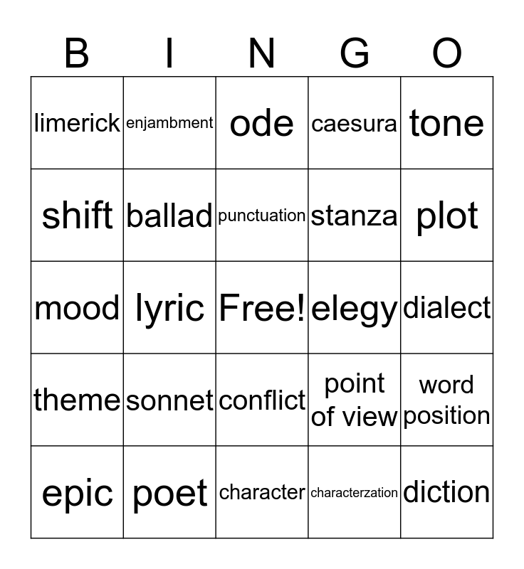 This bingo card has a free space and 29 words: epic, narrative, lyric, free verse, limerick, ode, ballad, sonnet, elegy, poet, dialect, diction, character, characterzation, plot, speaker, conflict, theme, tone, mood, point of view, line verse, stanza, shift, caesura, enjambment, word position, punctuation and rhyming couplet.