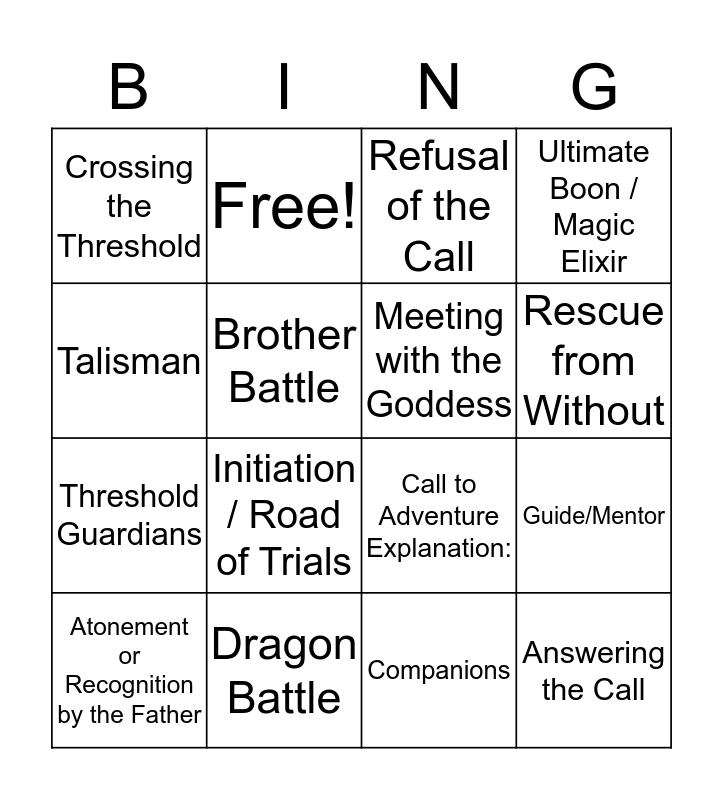 This bingo card has 19 words: Call to Adventure Explanation:, Call to Adventure, Refusal of the Call, Answering the Call, Guide/Mentor, Talisman, Companions, Crossing the Threshold, Free!, Threshold Guardians, Initiation / Road of Trials, Brother Battle, Meeting with the Goddess, Dragon Battle, Atonement or Recognition by the Father, Entering the Belly of the Whale, Ultimate Boon / Magic Elixir, Rescue from Without and Freedom to Live.